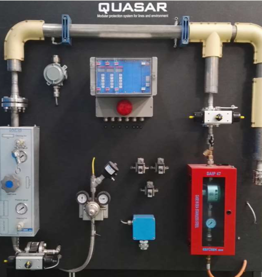 Il cuore del QUASAR è un sistema di analisi centralizzato, in grado di rilevare le eventuali perdite di gas nell’ambiente, con sensori posti all’interno della camicia di protezione, per individuare con esattezza dove si trovi la perdita ed intervenire. In base all’entità della perdita, il sistema è in grado di rilevare tre soglie di allarme, ognuna delle quali è seguita da differenti tipi di allarmi ed azioni, da un allarme acustico e sonoro di avviso agli operatori della linea o della postazione, ad un blocco remoto dell’intero impianto e di un purging in caso di perdite più gravi. Il sistema si completa inoltre di pannelli di intercettazione gas, dotati di sistemi di rilevazione pressione, prelievo gas e purging, in grado di isolare un solo tratto della tubazione, per permettere agli operatori di individuare la perdita di gas senza causare un fermo impianto.
