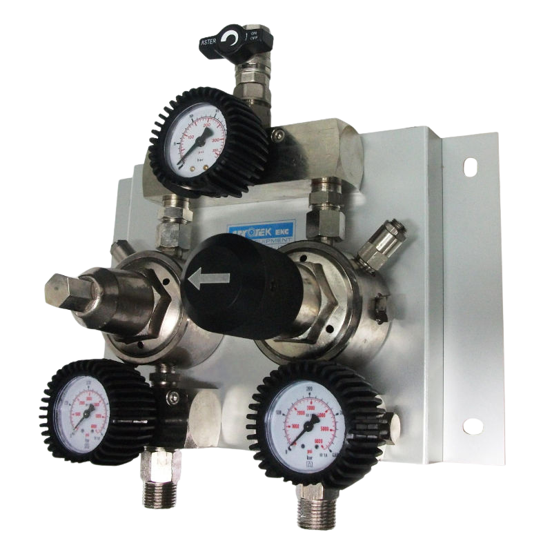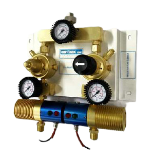 Dotato di due manometri in ingresso e un manometro in uscita per un monitoraggio continuo delle pressioni, valvole di sovrappressione poste direttamente sul corpo riduttore e di una valvola a sfera in uscita che ne permette un semplice scollegamento dalla linea consentendo una facile manutenzione.